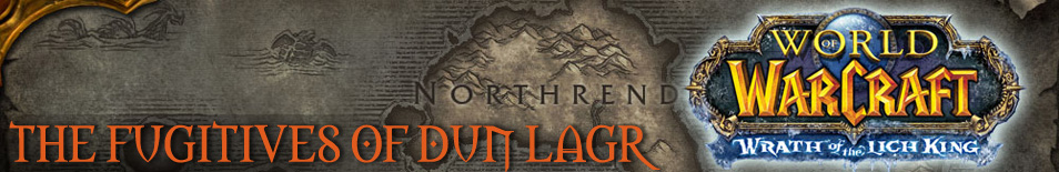 The Fugitives of Dun Lagr is a Dwarf-centric guild hosted on the Kilrogg Realm of the massively multiplayer online role-playing game World of Warcraft® developed and published by Blizzard Entertainment®. If you are interested in joining, please send an in-game message to one of the following characters: Grogfroth, Flaskhelm, Gewurtz, or Grumbleswill.